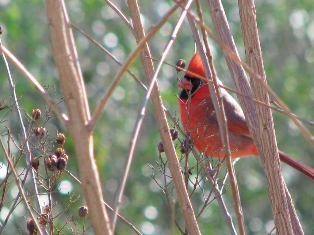 One of our living room windows (located right next to the couch) overlooks one of our birdfeeders and a bluebird box. It's a perfect spot to take candid photos -- like the close up of the female cardinal -- without sacrificing a lot of visual clarity with an extreme zoom (I'm using a Canon S5 IS camera). A couple of weeks ago, the hummingbird showed up, so we stuck a feeder via some suction cups directly on our previously-spotless window. The little guy has a monopoly (for now) on the nectar, so he's there all throughout the day. In a little while, I'm sure some friends/enemies will join the party and the dogfighting will begin. They are ruthless.