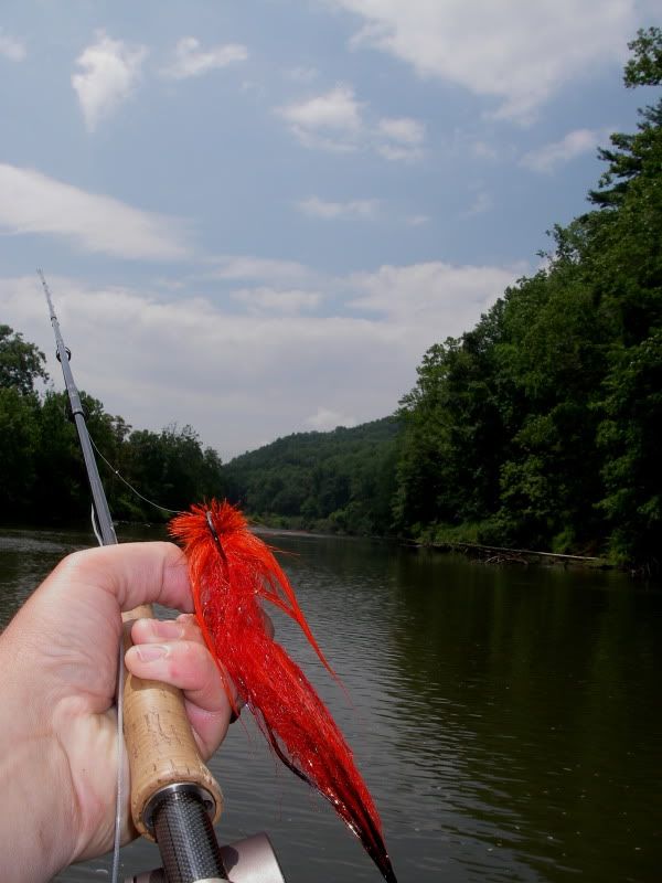 I stripped the bright orange articulated fly (my attempt at a Brad Bohen Hangtime) over a deep log filled pool, and out of the depths a beautiful 40+ inch musky scarfed the fly.