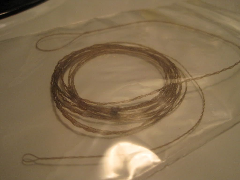 Anyhow, there really isnt a need to keep it tight at all.  Just twisting with your fingers is sufficient.  The 'tag' ends just need to be free flowing for the most part.  As he said in the video, just keep the two ends separated otherwise they'll twist eachother up into a big ole mess.  When I was working with the longer pieces I formed like a triangle.  the completed leader going straight out from me, and each of the tag ends for lack of a better term on each side of me.  Its a good idea to take your time and keep everything from twisting up.  The twist you impart on the completed leader is all you want twisted, and then keep the leader itself from twisting up.  Every couple inches (4-6 or so) I'd kind of play with the 3 ends and keep them straight if possible.  If I didnt, it got messy and caused me a lot of work.
