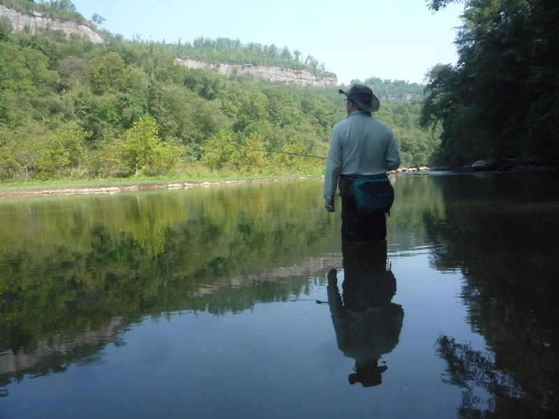 We made it back down to the river after a long, hot, steep hike Friday afternoon and found the river in good shape with red horse suspended a couple of feet under the surface and smallmouth swimming lazily through them. I had high hopes for catching fish, but they seemed to be off their feed and did not co-operate. The top water bite was off and I only managed a couple of foot long smallmouth on a Mertz copper tinsel crayfish pattern.