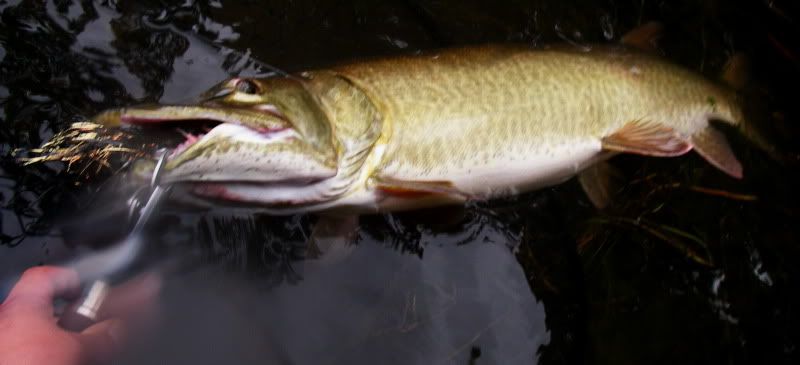 I was about to lose hope, but then the wind calmed for a bit. On the glassy water, I sank my fly down to the branches of a deep tree. As I stripped it in, I could see a nice musky in hot pursuit…surely coming in for the kill. As he neared the boat, he veered off suddenly…as if frightened off by danger—I thought somehow I had spooked the fish.