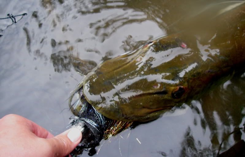She took the whole fly in and two of the three(8-0 and 3-0) hooks got her behind the first row of teeth—this fish had some serious daggers. If I didn’t have the boga, jaw-spreaders, and super long needle nose pliers, I would never have gotten the hooks out. The hooks curled out clean with no tears or bleeding.