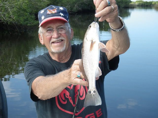 Next day, I went out a bit with my folks' skiff to see what I could do up in the Peace River/Shell Creek area. I don't really know much at all about fishing this area or this style of water. I was messing around and an old-timer just two spots down hollered from the bank 'You're fishing in the wrong spot!' I said something about not knowing anything about the area while wondering if he was trying to heckle me or what. He then proceeded to point out an area about fifty feet to the left of where I was fishing that was a deep hole made by the current. After he tried to give me some of his frozen shrimp, I invited him onto the boat. Fred proceeded to catch a couple of under-slot reds: