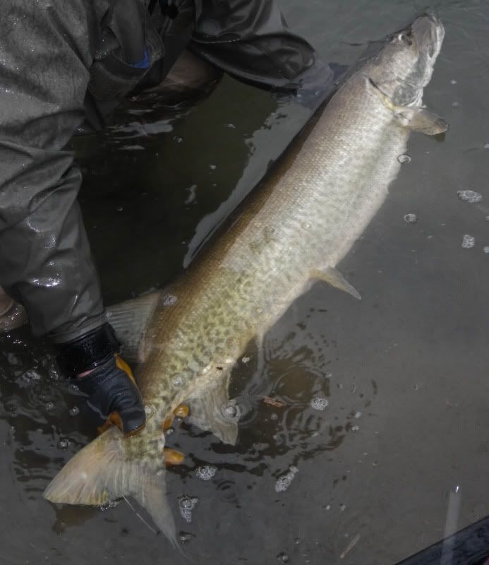 I’ve never seen a fish so pissed off and persistent in my life. I fought through some strong lunges,and soon had her settled down. With a firm hold on the Boga, Jay was real careful to keep the fish submerged under water until we could find a spot on the bank. This fish was fat! I noticed some sores, and I plucked off a lamprey that was clinging to her belly under the left pectoral fin. I chucked the eel onto the bank and got some photos, before returning this hefty girl back.