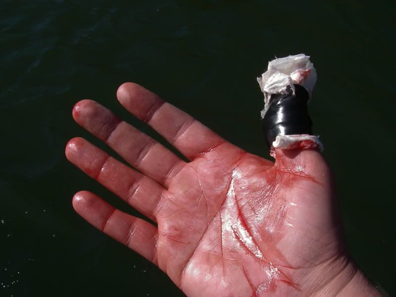 I took a fang in my thumb when I hoisted the fish up, but it was a battle scar I'm proud of. It's funny, I have about 4 pairs of gloves in the boat, but I didn't think to grab them once the fish was unhooked. Beautiful fish measured 44 1/2"