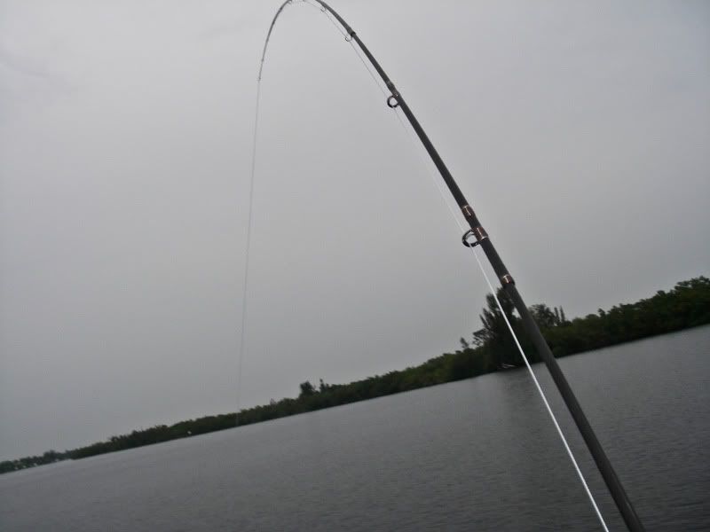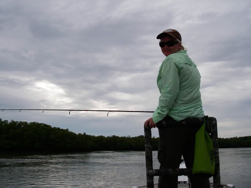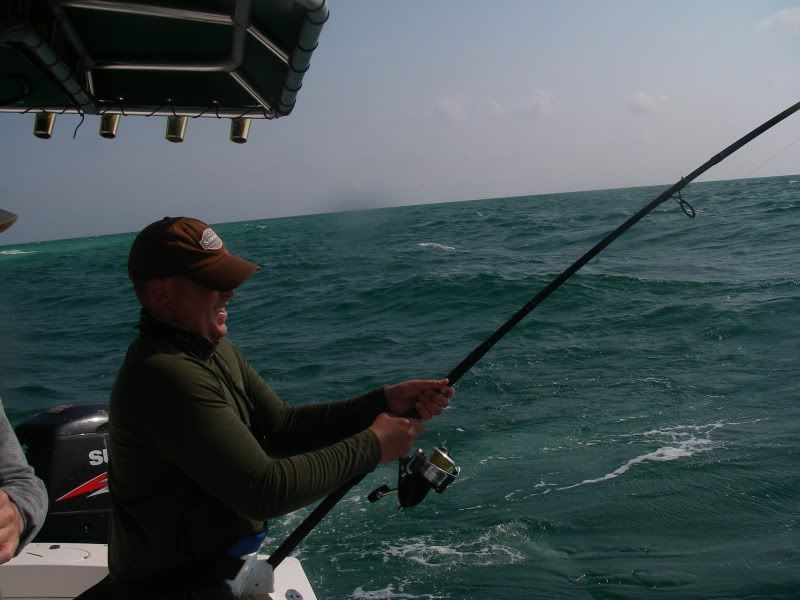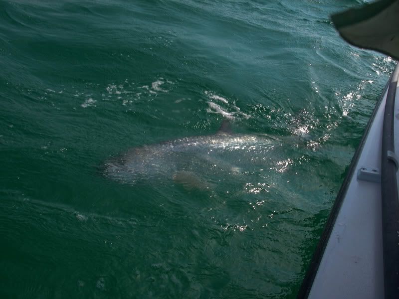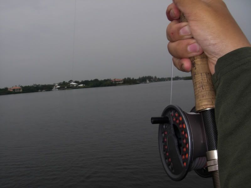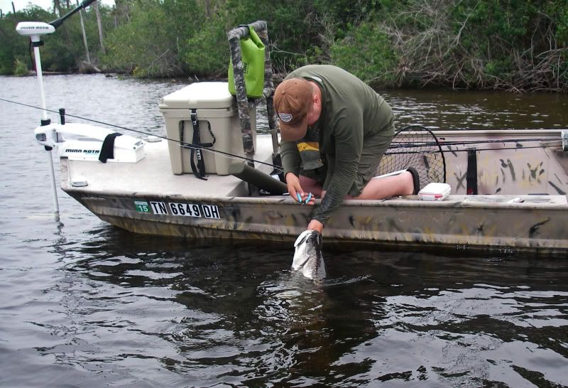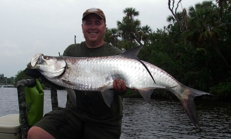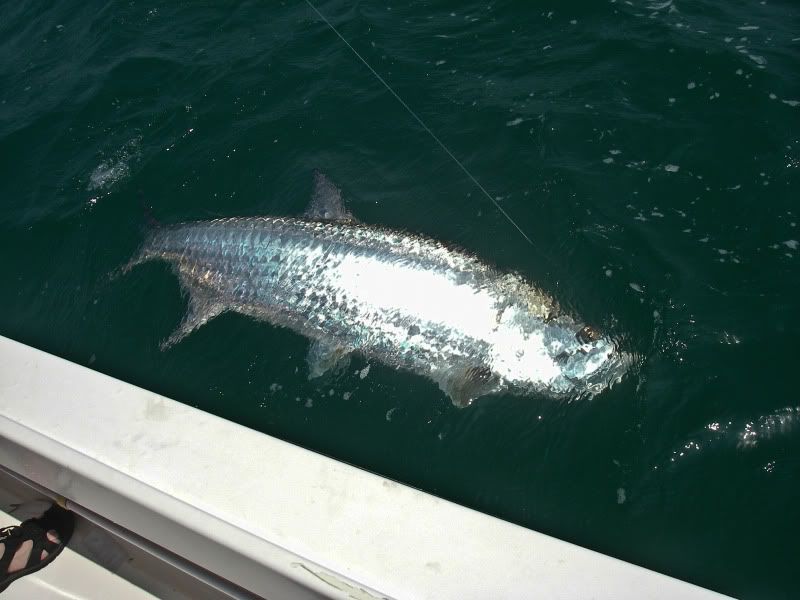 As my trip was nearing a close, I woke up early after a thunderstorm and took the SeaArk back to the same flat. On the glassy water, I could see an occaisional gulp from the tarpon. When you tried to use the trolling motor to draw near…they would disappear, then gulp about 100yds further away from you than the last time. I decided to troll so far, then let the tide draw me nearer to the fish, as I patterned their movements. I began to think that casting was hopeless. Then a great fish suddenly surfaced and took chase to my fly. He ate and missed three times before I stuck him. The battle was awesome, somersaults, cartwheels, and rattling gills. I chased him around the bay for about 20 minutes, as he tried to stay under the boat. Couple girls on a jet ski stopped by and helped me take photos...probably around 50 lbs. My knuckles were scarred and my fly was bent as I tried to free it from his dense sandpaper crushers on the roof of his mouth. I will not forget it.