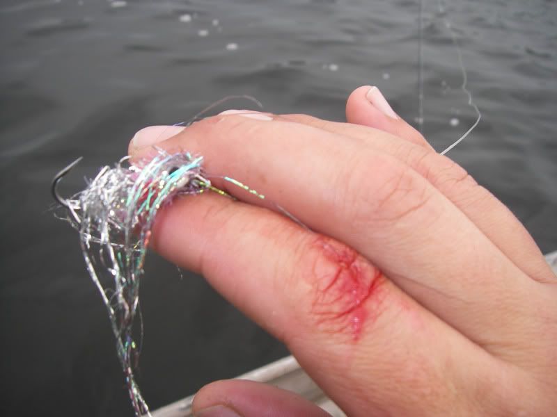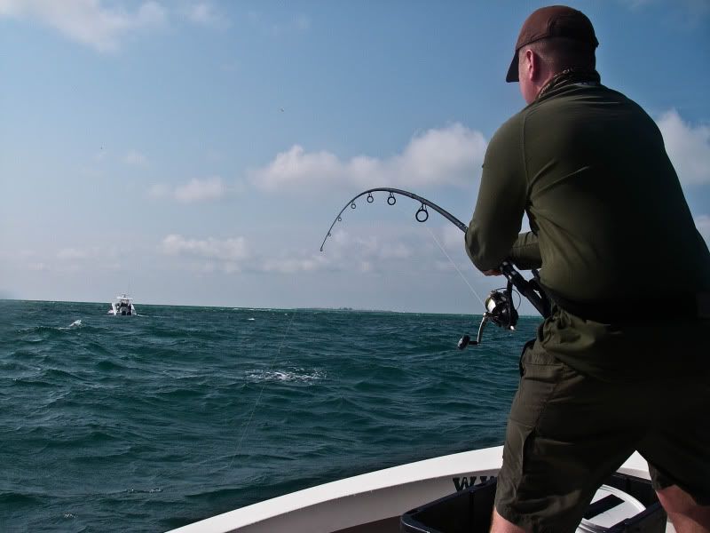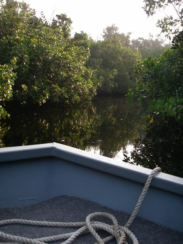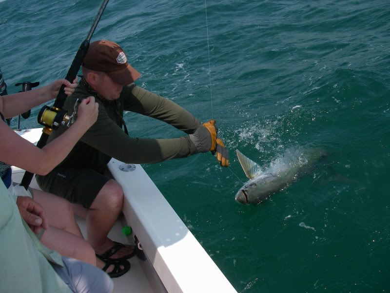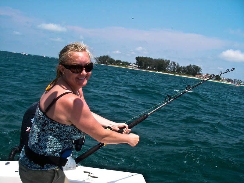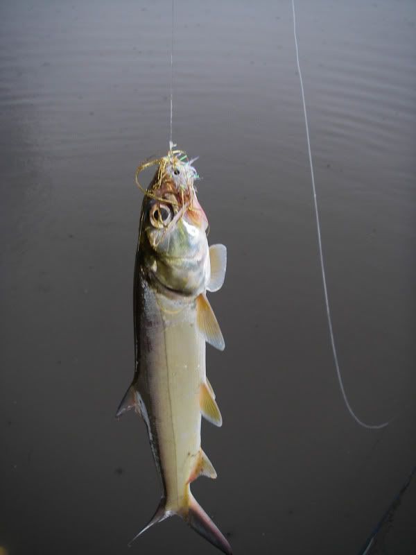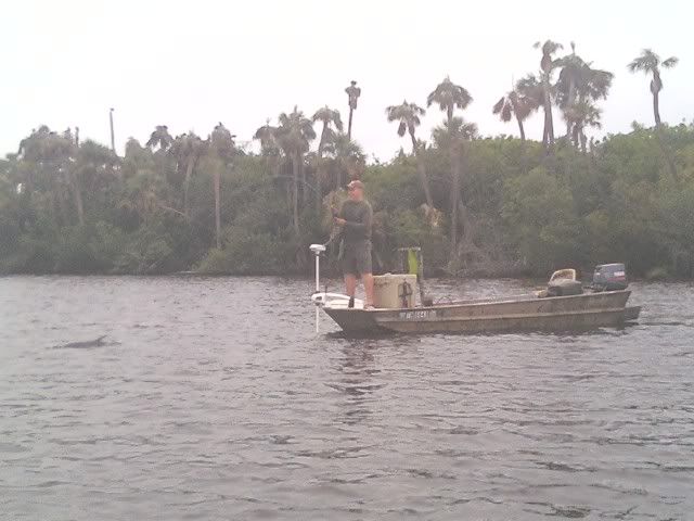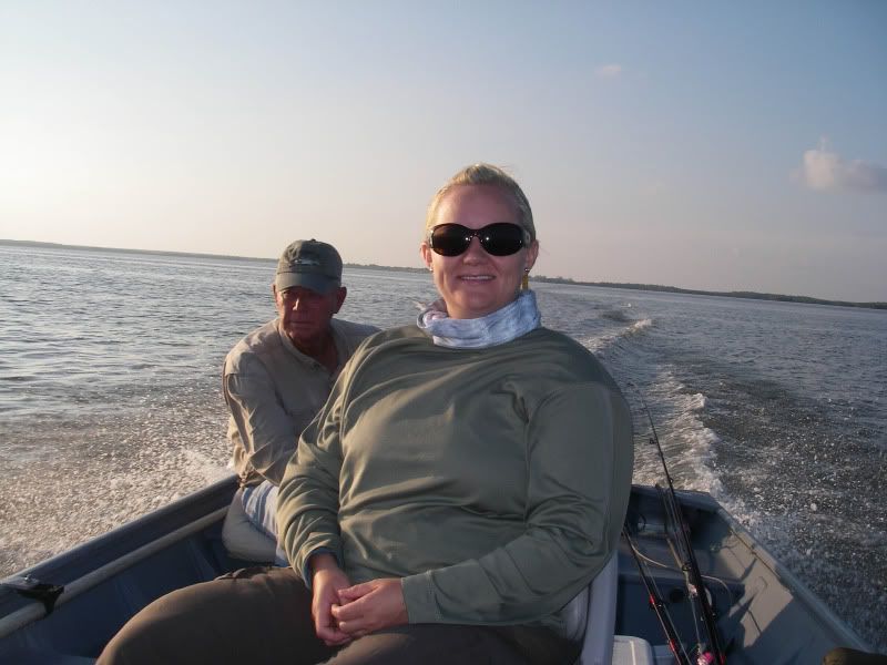 As my trip was nearing a close, I woke up early after a thunderstorm and took the SeaArk back to the same flat. On the glassy water, I could see an occaisional gulp from the tarpon. When you tried to use the trolling motor to draw near…they would disappear, then gulp about 100yds further away from you than the last time. I decided to troll so far, then let the tide draw me nearer to the fish, as I patterned their movements. I began to think that casting was hopeless. Then a great fish suddenly surfaced and took chase to my fly. He ate and missed three times before I stuck him. The battle was awesome, somersaults, cartwheels, and rattling gills. I chased him around the bay for about 20 minutes, as he tried to stay under the boat. Couple girls on a jet ski stopped by and helped me take photos...probably around 50 lbs. My knuckles were scarred and my fly was bent as I tried to free it from his dense sandpaper crushers on the roof of his mouth. I will not forget it.