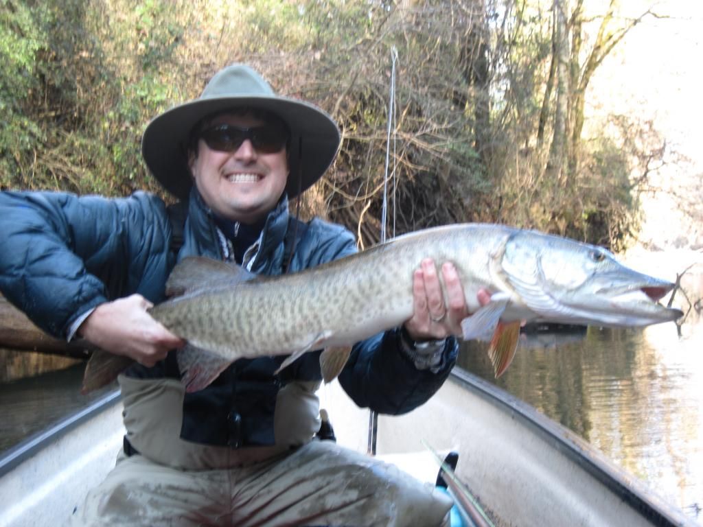 Yesterday, with my friend Eric, I finally put a Musky in the boat!!! We met at dawn on a middle TN river boat ramp to hunt for the day. Ran upstream a few miles and fished our way back down. Just above a big deep hole, I got a hot follow from a nice fish. It stayed with the fly through a couple figure eights and fell off. I slapped the fish on the head with the fly and it started following again. It fell off the fly again. I thought it was done. Eric said, "he turned under the boat, get your fly back out there!" I slapped the water hard again, and the fish rocket out from under the boat and swallowed the fly. One moment the fly was in front of its nose, the next, it just disappeared. I strip-set and felt the weight. Eric said, "hit him again" I hit it twice more and the fight was on. I put the fish on the reel and kept the battle tight to the boat. A few tense moments later, a 39" Tennessee Muskellunge was in the net! The fly was right in the corner of its mouth and popped right out. We took some pictures and put the fish back in the water to revive it. A couple minutes later, the fish started bucking and let us know it was ready to go.