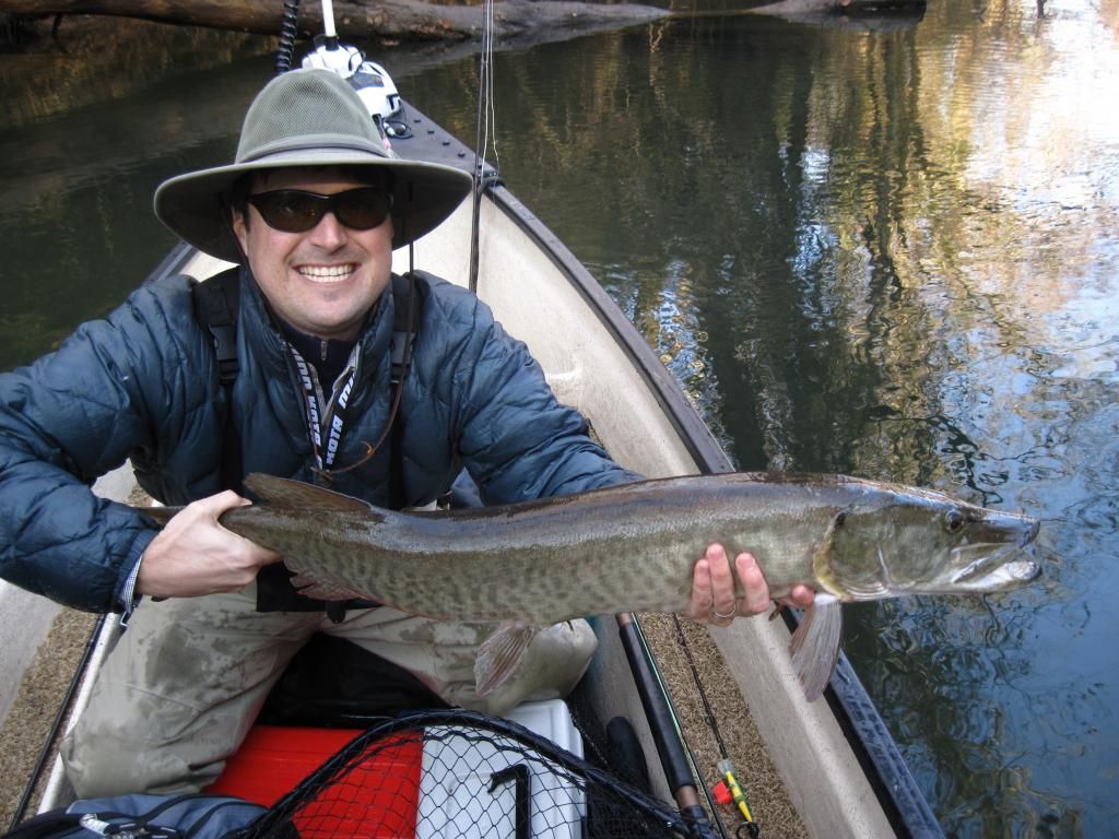 In August of 2008, I made the journey from Utah to North Carolina to fish with my old trout bum friend, Owen. This trip changed the focus of my angling passion. He guides for a outfitter in Boone and had started fish for two new species of fish. After an obligatory first day of trout fishing one of our old haunts, we set out on a two day float of a nearby river to target Smallmouth and Musky. We had a great trip and stuck many Smallies. Some of you know, I am a Smallmouth junkie these days from my previous posts. My Smallmouth habit was formed on this trip as well. But, there was one moment that hooked me on Muskies for good. We got to a deep flat and Owen handed me a big spinning rod with a huge bucktail spinner on it. He said we were switching to Muskies and for me to try it out. About a half hour later, just as I was starting to wonder why we had stopped catching Smallmouth to wear ourselves out throwing these giant lures, two huge Muskies appeared side-by-side right behind my spinner. I nearly jumped out of the bow at the sight of these mean freshwater fish making a bee-line towards my lure. Needless to say, rookie me did not make the smooth transition into a figure 8 that may have sealed the deal, but from that moment on, I was a Musky hunter.