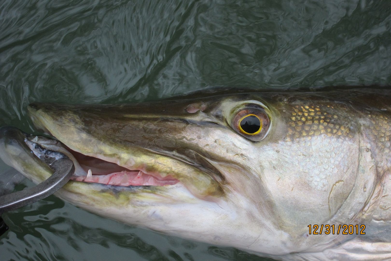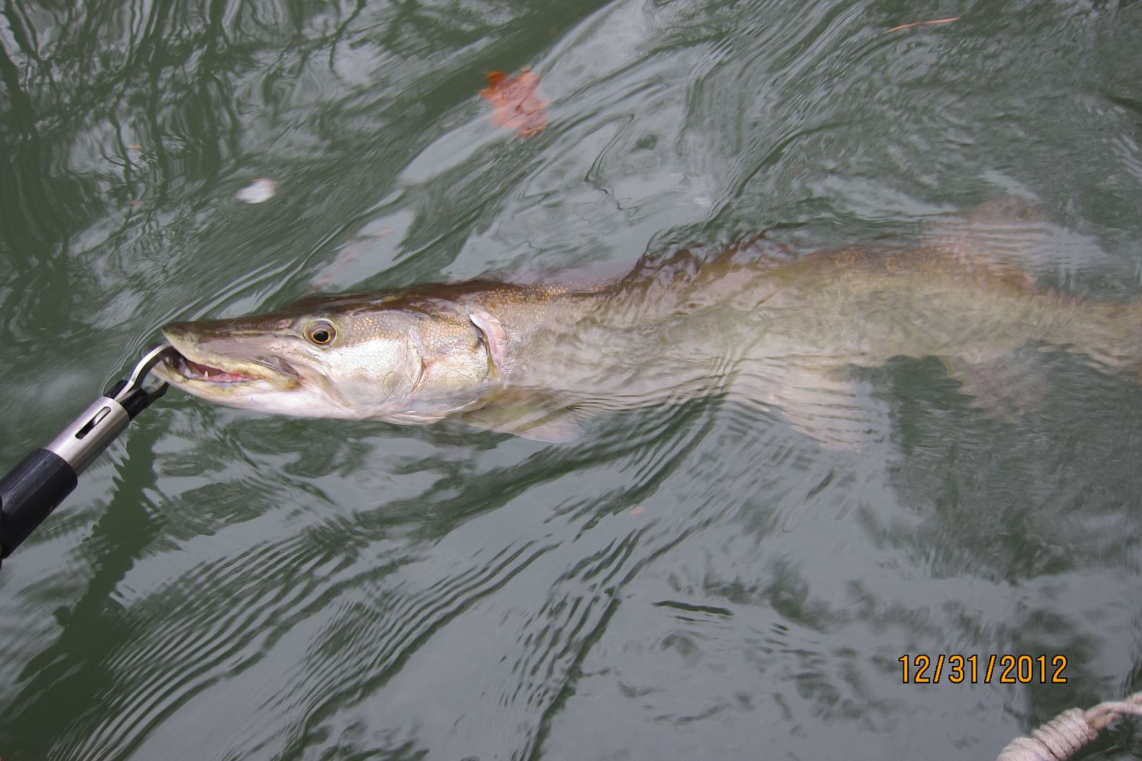 i ran back down to the hole where i missed him, i started fishing well above where he was, second cast i moved a very large fish, but not the fish from ealier, but this fish would have none of my offering. about 50 yards down stream was THE tree!! I put a cast just upstream and let it swing past...........................WHAM!!!!!!!! ......................................................THIS TIME I WEAS READY!!!!!!!!I strip set, and then again and the fight was on!! After a few minutes i put the net under my last Musky of 2012.
