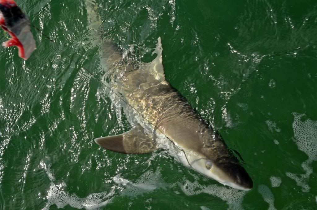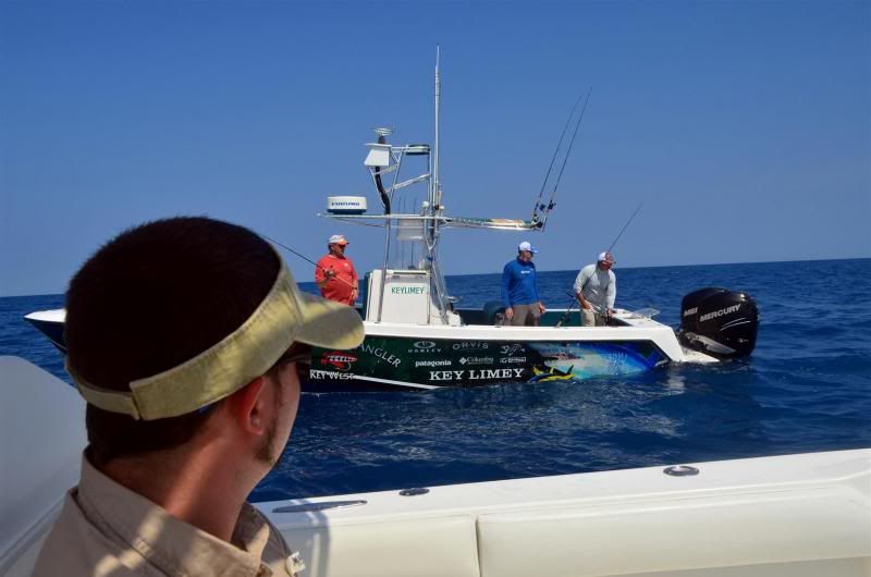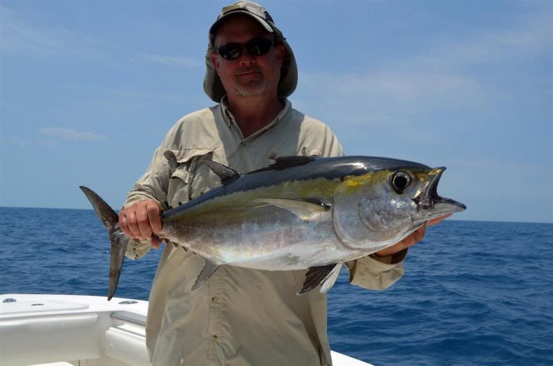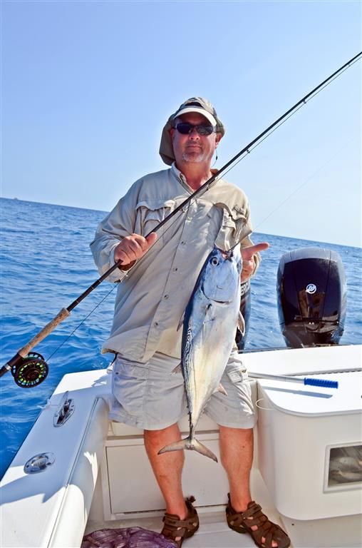 I saw these fish do something that I’ve not encountered with Mahi before – they were both color and size specific in what they wanted to eat. Due to the fact that I was dealing with the boat and trying to get the trolling gear under control as well as trying to chum a little to keep the fish close to the boat after we found them it was still a while before I actually got to fish. At first I just tossed a live pinfish in the middle of several mahi. For a couple of minutes the mahi just swam around looking at the pinfish showing no real interest in eating it. Weird, very weird in my limited experience. One finally did eat it though so I then baited up and tossed them one with a hook. The situation more or less replayed itself with it taking a while before one finally ate it. I left that fish swimming beside the boat for a long time in an attempt to keep the school close by. In the meantime the sluggo body on the bait one of my sons had been using got torn up beyond being usable. It was a black with silver body color. He replaced it with a white body. They wouldn’t eat it! They’d follow it but not eat it. After a while he changed back to a dark color and bingo he hooked up. Meanwhile after watching them only reluctantly eat the pinfish I thought perhaps I should show them a squid…something I’ve never seen them turn down in the past. Hooked up an entire squid on a smaller circle hook(4/0 ?) with a fluorocarbon leader and tossed it to some swimming near the boat. One of them immediately swam over to it, looked it over and swam away a short distance before returning only to repeat the behavior. I was flabbergasted that it didn’t eat that squid. Meanwhile the fish I’d had on leash had self-released jumping around behind the boat so I grabbed another pin and tossed it out. It did get eaten and this fish I also left in the water swimming near the boat after fighting it for a bit. Since there were obviously a number of fish in the area, they weren’t particularly large and they seemed to want small baits anyway I decided to see if I could hook one on the fly. I rigged up the 8 weight that Jarrod gave me and tied on a small (tied on a #1 hook) streamer like fly I tied up with dark blue shoulders and silver flash over white. Presented it to a few fish and got the same reaction the white sluggo type bait got – they’d turn on it and follow it but not commit. Again somewhat amazed that they were being so picky I decided to try a different streamer type thing I’d tied up that had some dark green and gray colors to it. That they ate --- so long as I was stripping it for all I was worth. Reaction bite? Maybe – I dunno about that but I know it was fun! I caught a couple that way before we finally lost the schools for the last time.