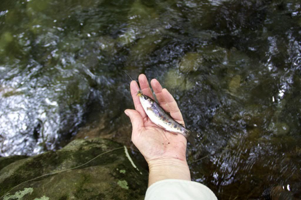 We both managed a few small rainbows on dries in the fast water. Here is Jennifer's fist wild trout on a dry fly and tenkara.