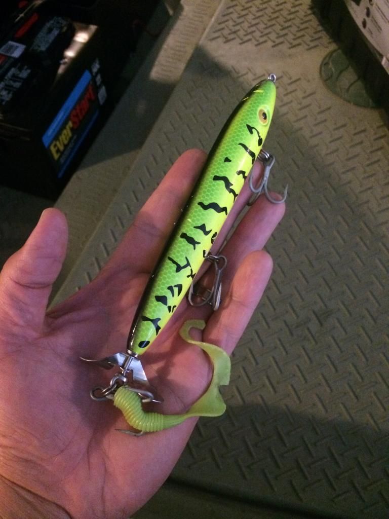 Working a shoal bubble line into a cliff wall with nice depth, shadows, and timber. Pulsed a chartreuse prop bait, slashing and churning up a nice spray.