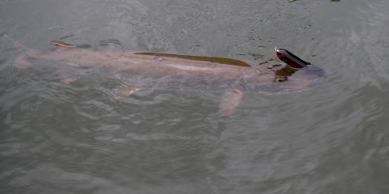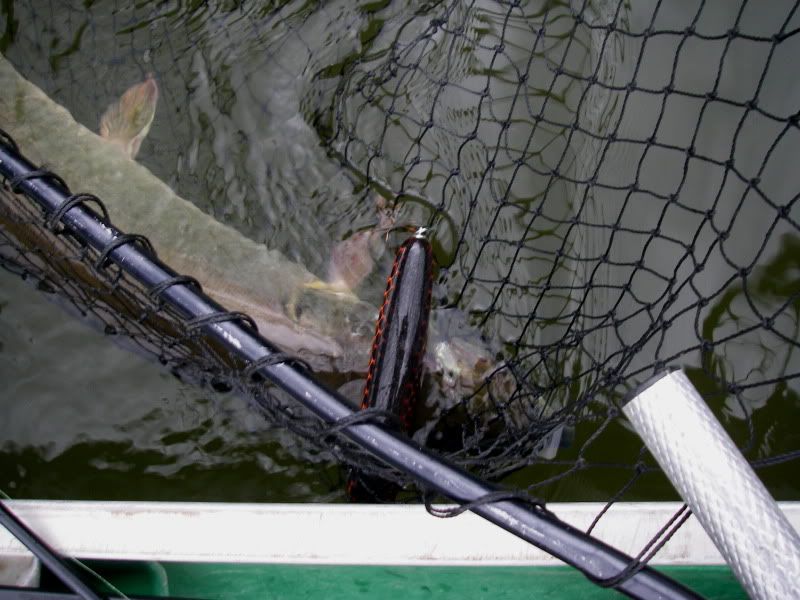 The fish wrestled and rolled, somersaulted, then calmed down.  He pulled my Crawdad in circles a few rounds then I finally netted him. I'm kicking myself for only having the smaller Striper net.  Luckily, it was adequate for this fish, about a tad over 40". He was hooked across the top of the head, and I really felt bad how the trebles had got him.  I  hopped in on a sandbar and kept the net in the water and the fish stayed reasonably calm, and still green.  A few tugs later, he was free, but he now has two scars on the back of his head Carved like initials in his skull!  I'll have a way to recognize him when he gets bigger.