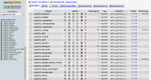 <?php // Hier den notwendogen Code zum Aufbauen der mySQL-Verbindung eingeben. DROP TABLE `cpg15x_albums`, `cpg15x_banned`, `cpg15x_bridge`, `cpg15x_categories`, `cpg15x_comments`, `cpg15x_config`, `cpg15x_dict`, `cpg15x_ecards`, `cpg15x_exif`, `cpg15x_favpics`, `cpg15x_filetypes`, `cpg15x_hit_stats`, `cpg15x_languages`, `cpg15x_pictures`, `cpg15x_plugins`, `cpg15x_sessions`, `cpg15x_temp_messages`, `cpg15x_usergroups`, `cpg15x_users`, `cpg15x_votes`, `cpg15x_vote_stats`; ?>speichere die Datei als "droptables.php" und lade die Datei auf Deinen Webserver mit Hilfe Deiner FTP-Applikation in das Verzeichnis, in dem Coppermine installiert ist. Führe dann die Datei aus, die Du eben hochgeladen hast, indem Du die URL der Datei in die Adreßzeile Deines Browsers eingibts, etwa so http://deine-seite.de/dein_coppermine_verzeichnis/droptables.php