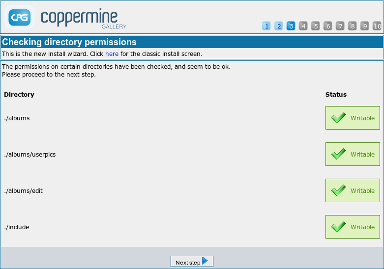 Coppermine needs write permissions in some sub-folders as suggested in Setting permissions. The installer can't set those permissions for you, so you need to set them in advance. If you have done so successfully, all folders that the install wizard checks in this stage should be marked as "OK". If this is not the case for you (i.e. if the install wizard complains about missing permissions in one or more folders), just leave the browser window as it is and set permissions properly. After having done so, return to the install screen that you have left open in your browser and refresh the page (by using the corresponding refresh button in your browser) to see if the permission issue has been solved.